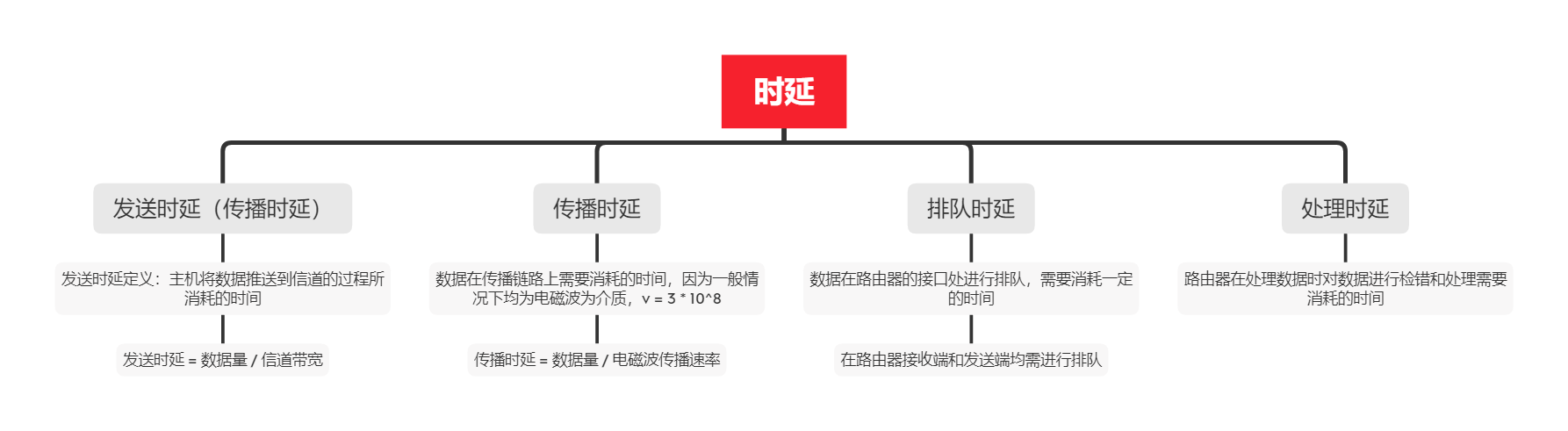 - 传播时延(由于介质一定,一般情况下无法降低传播时延)